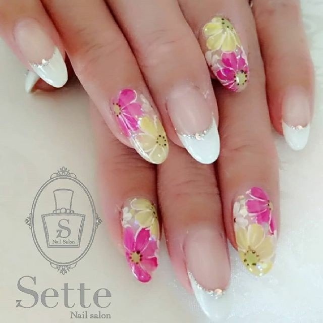 春 フレンチ フラワー ホワイト ピンク Nailsalon Setteのネイル