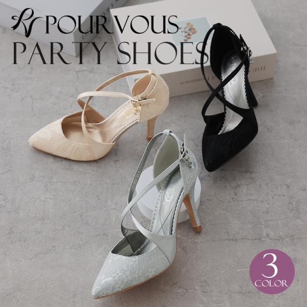 パンプス ビジュー レース パーティーシューズ ストラップ 靴 結婚式