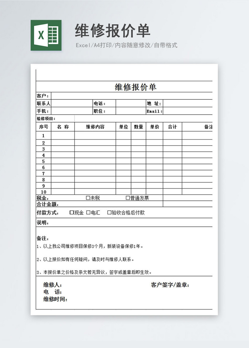 维修报价单excel模板图片 正版模板下载400154556 摄图网