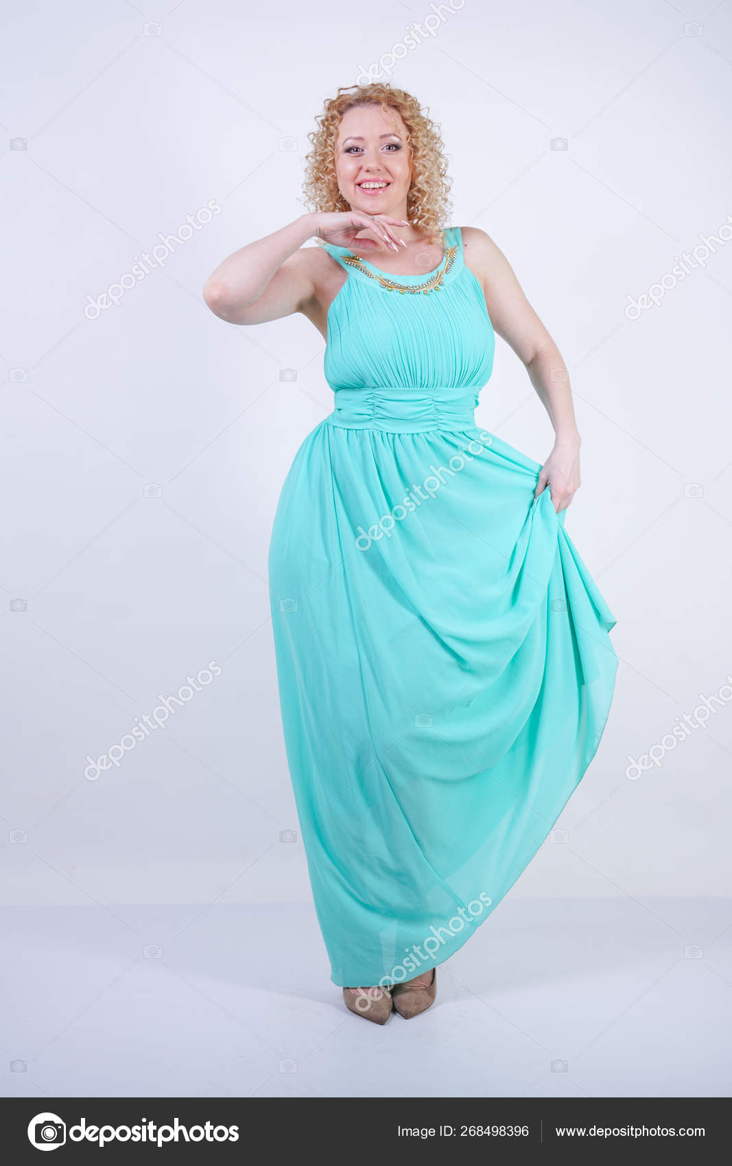 漂亮的金发白人妇女穿着长蓝色时尚夏装白色背景 图库照片 C Agnadevi